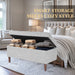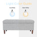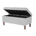 Plush yet practical, this tufted storage bench provides a variety of home décor options. Use it as a coffee table ottoman in a living room to serve guests. Position it in a family room to relax feet on after a long day. Place it as an end of bed bench to hold pillows and blankets. With wood round shaped legs in a mid tone walnut finish, soft textured fabric in a neutral gray, and a hinged lid for easy access, this large tufted storage bench is a premium addition for any home. Easy to assemble and maintain.