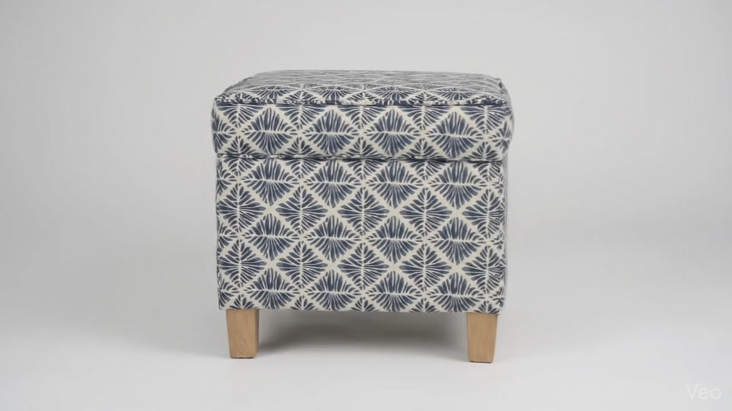 Bring subtle style and modern simplicity to your space with this square storage ottoman with lift-off top. Upholstered in a modern, blue geometric fabric that is 100% cotton, this low-profile design creates a clean, minimalist silhouette with warm, natural wood legs. Perfect as a small accent seat, footrest, or stylish decor piece. Durable, easy to maintain.