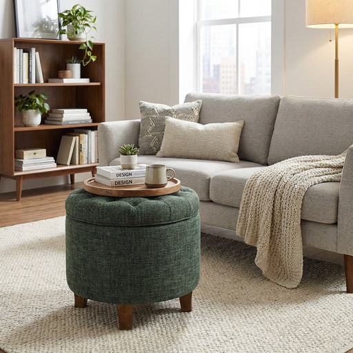 Small Tufted Round Storage Ottoman - Green Clover Fabric